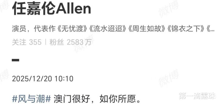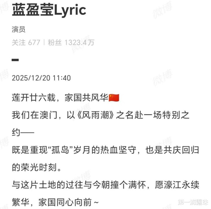 12月19日,《风与潮》澳门不雅影雷同会在澳门得胜举行。在雷同会得胜举行和澳门总结26周年之际,《风与潮》女主乔音婉演员蓝盈莹写说念:莲开廿六载,家国共风华。