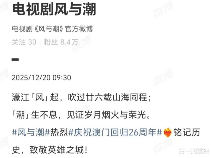 澳门总结26周年,《风与潮》剧组发文庆祝:濠江风起,吹过廿六载山海同程;潮生持续,见证岁月烟火与荣光。